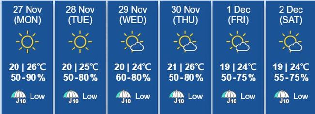 이번주는 대체적으로 맑겠으며 낮과 밤의 차가 크겠다중반에는 동쪽에서 불어오는 바람으로 구름이 많이 낄 것으로 예상되며 후반에는 북동계절풍의 영향으로 기온이 다소 내려 갈 것으로 예상된다.