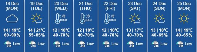 차가운 겨울바람의 영향으로 이번주는 구름이 많고 건조하겠으며 쌀쌀한 날씨가 이어지겠다. 오늘은 최저 14도, 최고 19도이며 목요일과 금요일에는 최저 12도로 더 낮아질 것으로 예상된다.