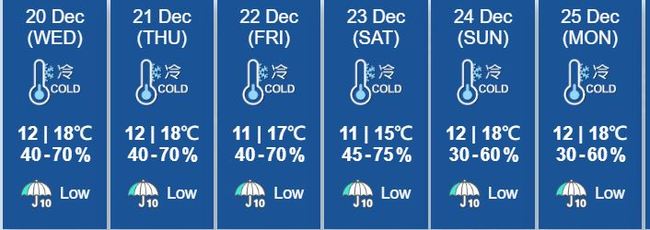 오늘과 내일 최저기온은 최저 12도, 최고 기온은 18도이며 오는 금요일에는 최저 11도까지 내려가 더 추워진다.