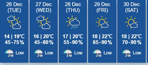북동쪽에서 불어오는 바람의 영향을 받겠으며 향후 며칠동안 점진적으로 기온이 올라갈 것으로 예상된다.