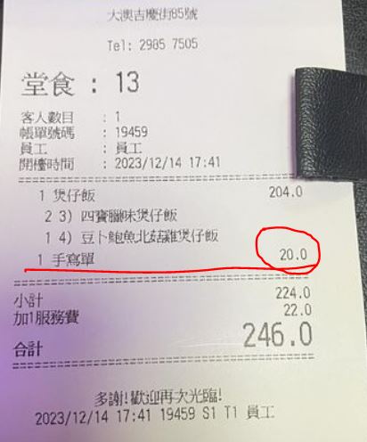 지난 1214Tai O, 85 Kat Hing Street, G/F 식당을 방문해 식사를 하고 난 뒤 계산서를 확인했더니 hkd20이 포함되었다네티즌들은 손으로 쓴 주문에 요금이 부과되다니 믿을 수 없다. ”터무니 없다.“는 등의 반응을 보였다.