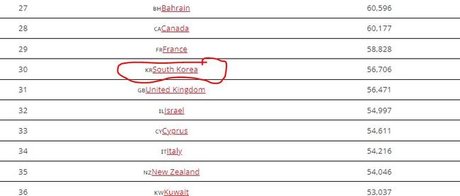 미국과 영국은 각각 9위와 31위에 올랐고, 한국은 30위, 중국은 77위를 기록했다.