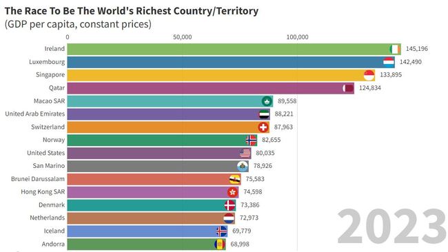 아일랜드가 가장 부유한 국가로 선정되었으며룩셈부르크와 싱가포르가 각각 2위와 3위,