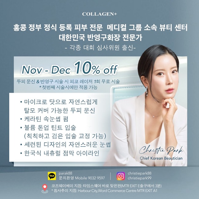▲ 콜라겐+ 피부과(홍콩 정식등록 피부 전문병원) : 각종 대회 심사위원 출신, 한국인 전문가 자연스러운 두피문신과 눈썹&아이라인 반영구, 선명한 입술, 케라틴 속눈썹 펌 문의 카톡 parak88 / 전화 9032 9597