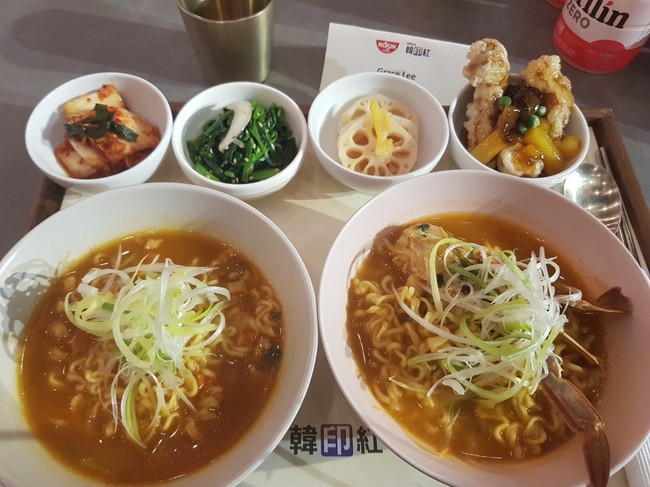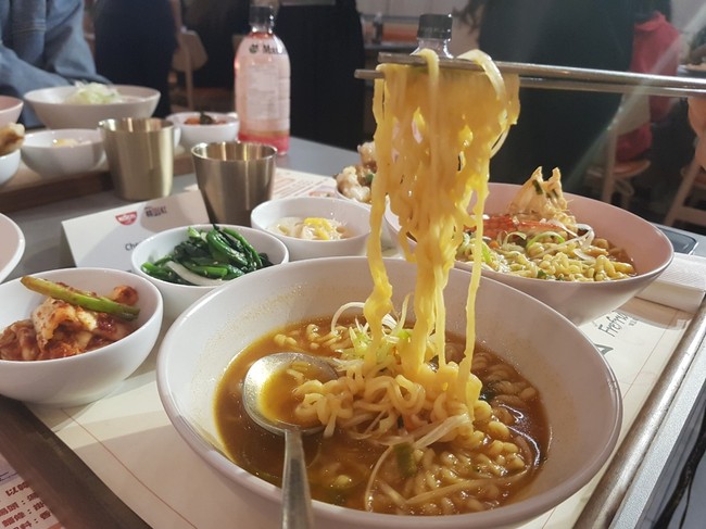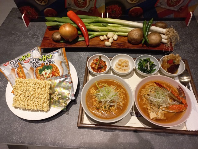 시식으로 대파가 듬쁙담긴 라면과 꽃게가 담긴 라면 두 가지가 나왔다. 신선한 대파의 식감은 시금치처럼 연하고 달짝지근하면서 향기로워 라면과 환상적인 음식궁합이 되었다.