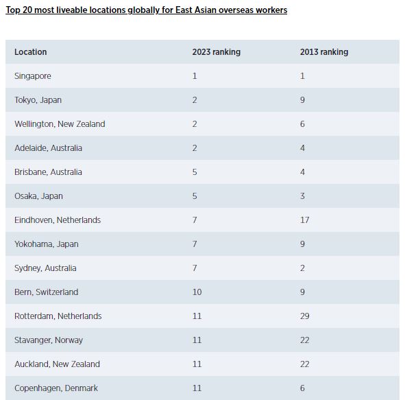 ECA 컨설팅 회사가 실시한 ‘2023 동아시아 해외근로자가 살기에 적합한 도시’ 조사에 따르면 펜데믹 방역조치가 해제되면서 홍콩이 동아시아 외국인이 살기에 좋은 환경으로 전년대비 향상되었다.