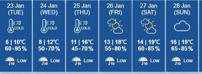 천문대는 한파경보를 발령했으며 오늘 최저기온은 6도이다. 강한 해상풍으로 해변도로가 미끄러울 수 있어 운전자와 자전거 운전자는 주의해야한다. 내일과 목요일까지 바람이 불고 지역에 따라 비가 내려 추운날씨가 이어지겠다.
