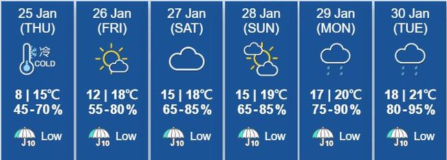 차가운 겨울바람으로 오늘과 내일 여전히 기온이 낮아 춥겠다. 오늘 최저기온은 8도, 낮최고 기온은 15도이다. 중국남부에 형성된 구름이 적어지면서 기온은 소폭 상승한다.