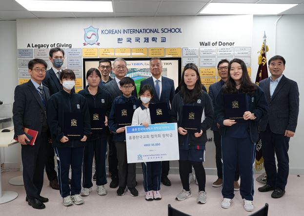 홍콩 한국국제학교(KIS, 이사장 조성건)는 지난 2월 1일 (목) 학교 헤리티지 센터에서 홍콩한국교회협의회 장학금 수여식을 거행하였다. 이날 장학금 전달 행사는 조윤태목사 (홍콩한국교회협의회 회장)가 직접 참석하여 장학금선정위원회의 심사를 거쳐 선정된 7명의 한국과정 학생들에게 총 HK$ 55,000의 장학금 및 장학증서를 전달하였다.