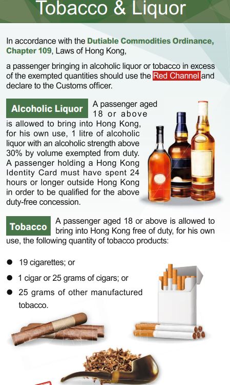 -담배 : 18세 이상 담배 19개비, 시가 1개, 또는 시가 25g (최대벌금 hkd100만, 징역 2년)