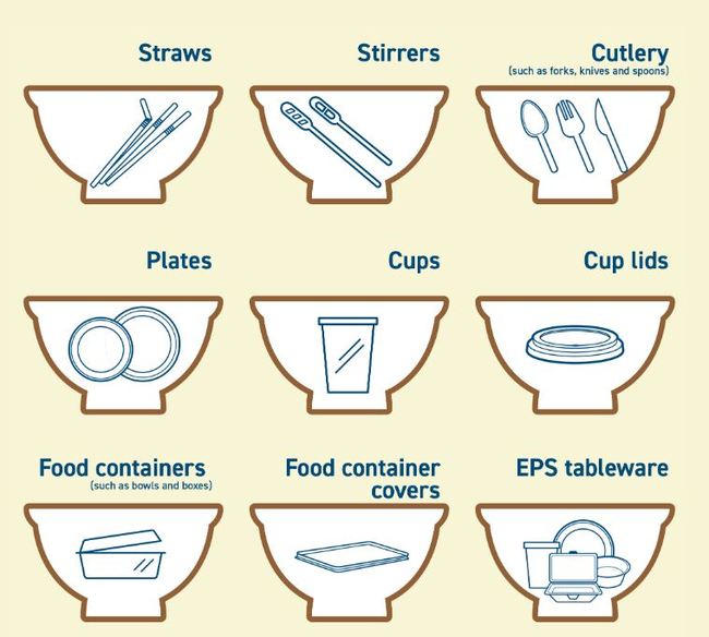 9가지 유형의 일회용 플라스틱 제품판매를 금지한다. 요식업 시설은 고객에게 금지제품를 제공해서는 안 된다.