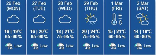 신선한 북동쪽 바람의 영향으로 이번주는 다소 시원한 날씨가 예상된다. 최저 16도로 이어지다가 주말에는 14도까지 내려가 추울 것으로 예상된다.