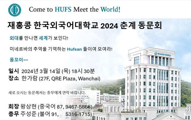 ■ 한국 외국어대학교 동문회 3월 14일(목) 문의:왕상현 회장 9467 5866, 주성준 총무 5316 1715