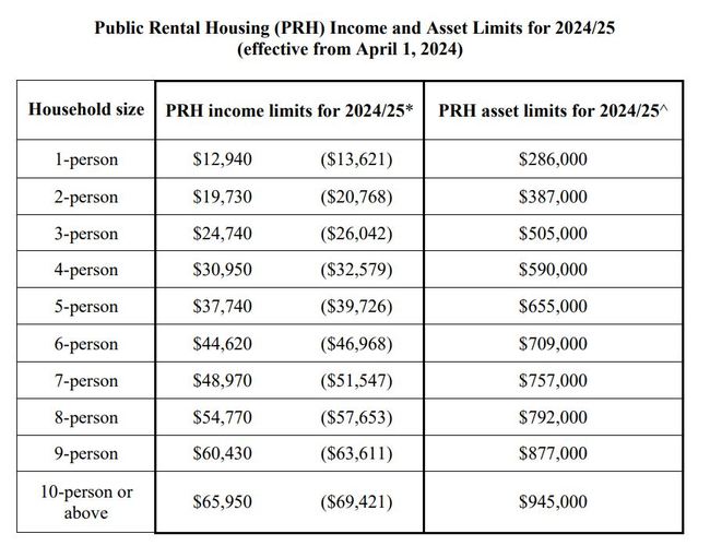 공공임대주택 자산한도는 매년 검토된다. 1인가구 수입 한도(hkd286,000), 2인가구(hkd387,000), 3인가구(hkd505,000), 4인가구(hkd590,000)으로 제한된다.