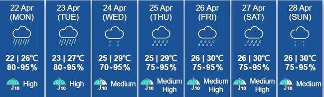 오늘과 내일 저기압의 영향으로 천둥번개를 동반한 소나기가 내리겠다. 오늘은  최저 22도 낮최고 26도이다. 이번 주 내내 불안정한 날씨로 소나기가 내릴 것으로 예상된다
