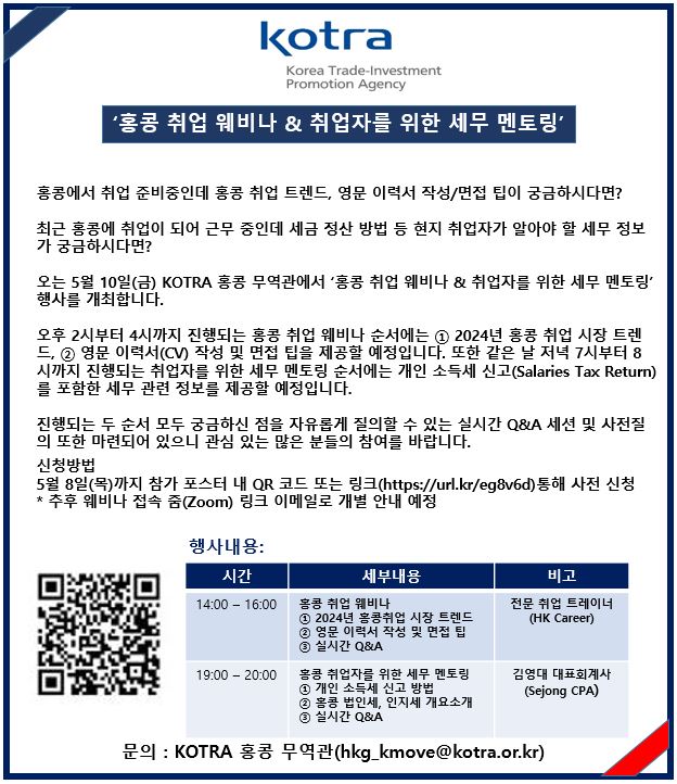 ■코트라홍콩, '홍콩 취업웨비나 & 취업자를 위한 세무 멘토링'