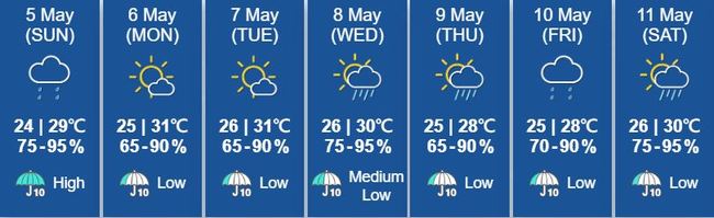 홍콩은 점차적으로 고기압의 영향을 받아 향후 며칠 간은 맑고 덥다가 수요일 경에는 홍콩전역에 몇 차례 소나기가 내릴 것으로 예상된다