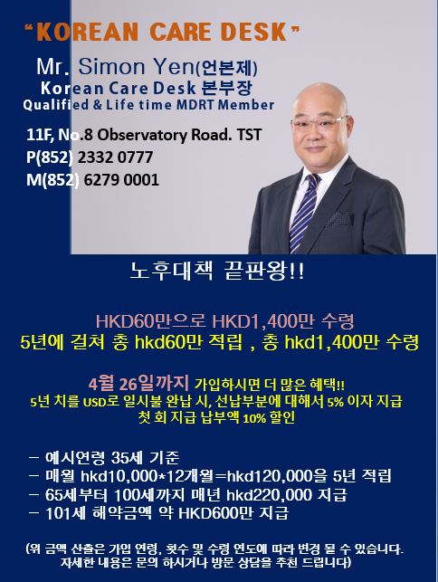 ■ 각종 보험, MPF 문의 : Korean Care Desk : tel. : 6279-0001) MPF 관련 & 각종보험 무료상담, 부담없이 문의하실 수 있습니다.