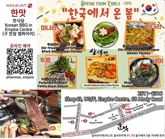 ▲ 한맛 엠파이어(구 한참 엠파이어) : 한참엠파이어가 '한맛'으로 변경 (HANMAT Korean Restaurant Empire Centre) 고기와 게장이 맛있는 문화나눔의 한식당, 동침사츄이 리갈구룡호텔 맞은편, 예약번호 2511 6316, 침사추이 P1, P2 출구