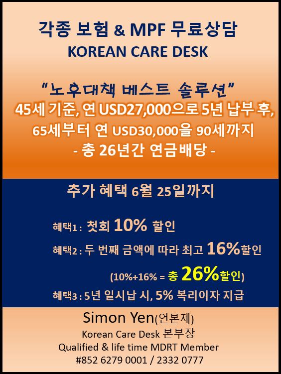 ■ 각종 보험, MPF 문의 : Korean Care Desk : tel. : 6279-0001) MPF 관련 & 각종보험 무료상담, 부담없이 문의하실 수 있습니다.