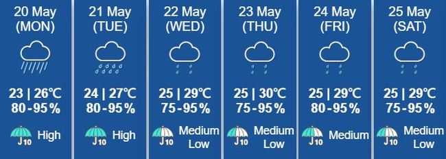 저기압의 영향으로 향후 며칠간 천둥번개를 동반한 소나기가 내리겠다. 오늘 최저 기온은 23도 낮최고 기온은 26도이다.