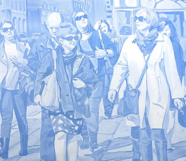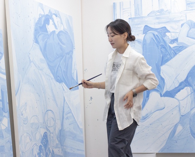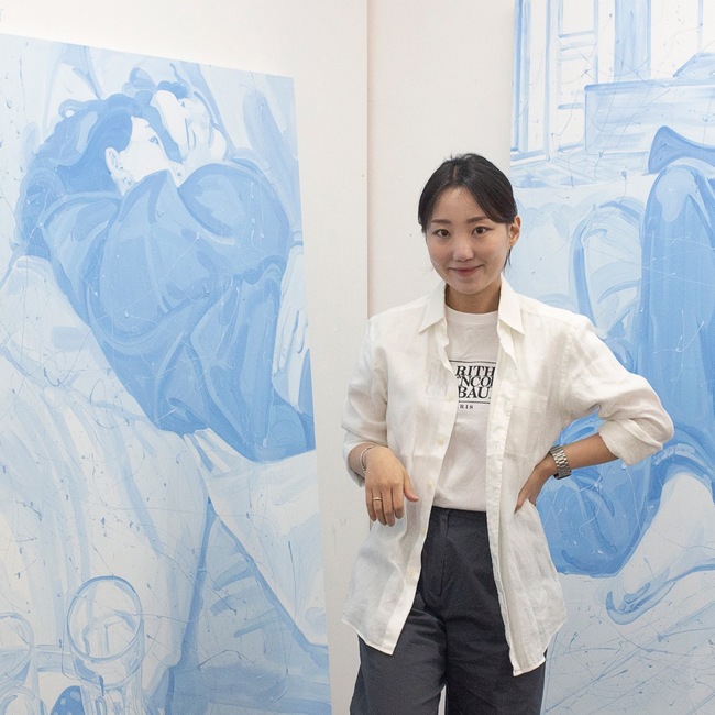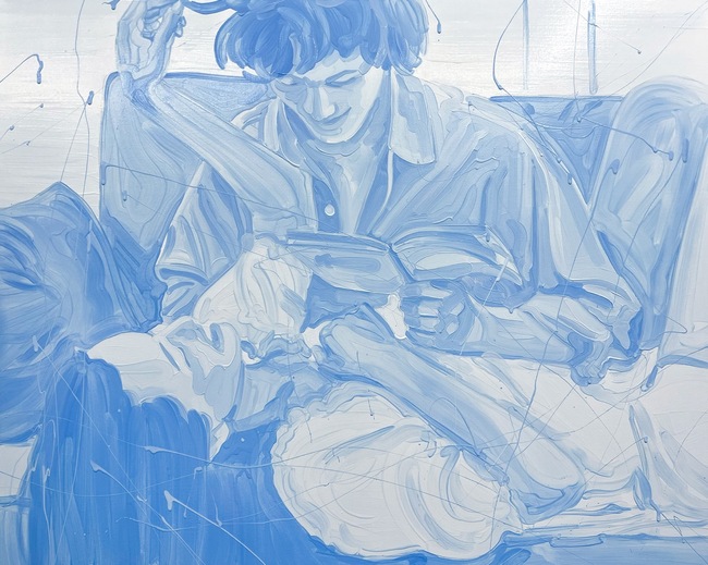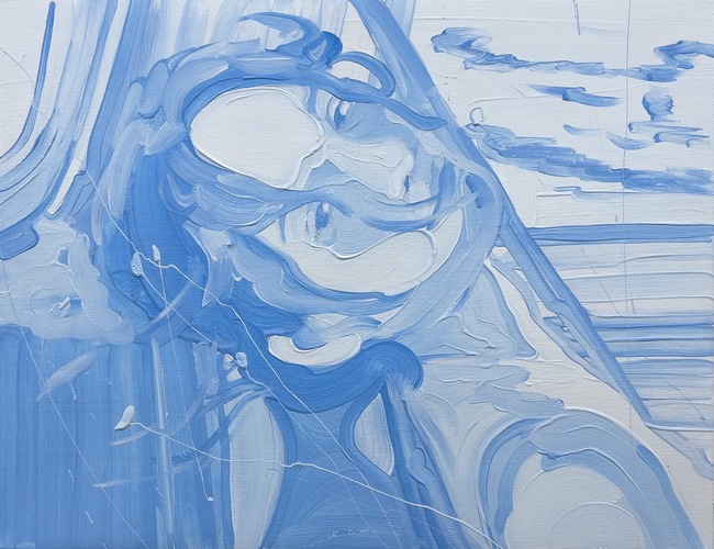 웹에서 발견한 이미지를 재구성하는 정지윤 작가의 작업 방식은 현대인의 온라인 관계 형성 과정과 닮아있다. 작가는 단순히 이미지를 복제하는 것에 그치지 않고, 화면 속 인물의 자세, 표정, 상태와 같은 조형적 특성에 집중해 회화적 언어로 재해석한다. 푸른 모노톤의 화면과 흩뿌려진 물감 드리핑은 원본 이미지가 지닌 시각적 특성을 제거하고, '사진'이 아닌 '회화'의 영역으로 끌어올린다.