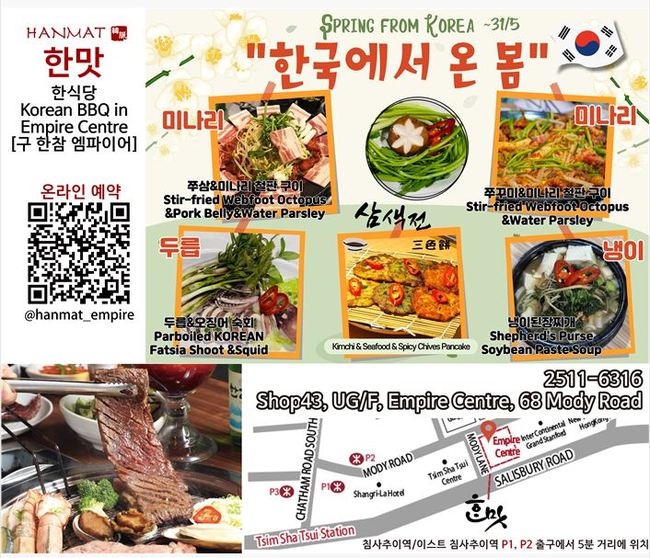 ▲ 한맛 엠파이어(구 한참 엠파이어) : 한참엠파이어가 '한맛'으로 변경 (HANMAT Korean Restaurant Empire Centre) 고기와 게장이 맛있는 문화나눔의 한식당, 동침사츄이 리갈구룡호텔 맞은편, 예약번호 2511 6316, 침사추이 P1, P2 출구