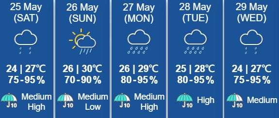 중국 남부 해안에 고기압의 영향이 점차 미치고 있어 오늘과 내일은 점차 개선될 것으로 예상된다. 오늘은 지역에 따라 소나기가 내리는 곳도 있겠으며 최저 24도, 낮최고는 27도이다.