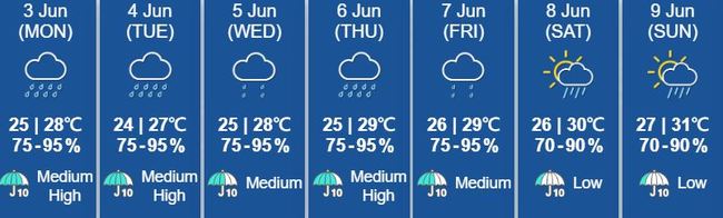 동쪽에서 불어오는 강한 바람으로 며칠 동안 바람이 불고 소나기가 내린다. 오늘의 최저 기온은 25도, 낮 최고 기운은 28도이다.