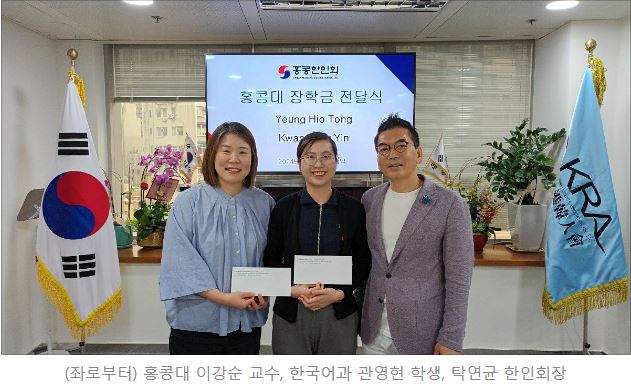 탁연균 한인회장은 6월 4일 한인회 사무처에서 홍콩대학교의 한국어를 전공하는 학생 2인에게 장학금을 전달하였다. 이강순 교수의 지도 아래 열심히 한국어를 공부하고 있는 Yeung Hio Tong(베키)와 Kwan Wing Yin(관영현) 학생이 올해 한인회 장학생으로 선발되었다.