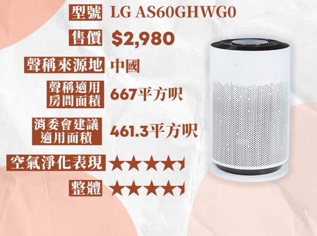 10개 제품 중 한국 LG제품이 1위로 평가되었으며 샤오미 공기청정기가 뒤를 이었다. 가장 최악으로 나타난 제품은 필립스 제품이다.