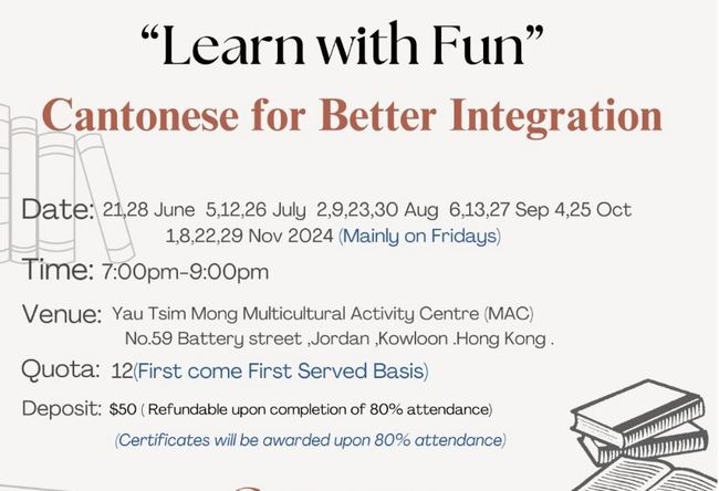 정부가 소수민족의 통합을 위해 무료로 광둥어와 영어수업을 지원한다홈어페어가 주관하여 실내 교실 수업과 외부활동으로 진행한다.