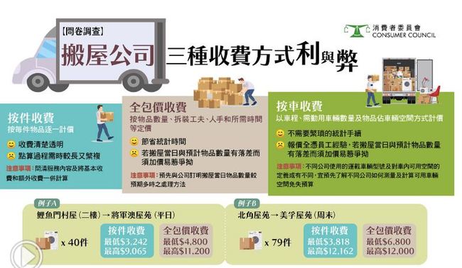 15일 소비자 위원회 조사 발표에 따르면 홍콩 이사업체 비용이 업체마다 1.3배 차이가 날 수 있다. 이사 당일, 가구와 상자의 양이 사전 견적량 보다 많을 경우 75%의 업체가 추가비용을 청구하고 있다. 하지만 명확한 요금기준이 있는 업체는 30%에 불과했다.
