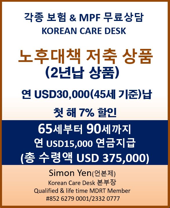 ■ 각종 보험, MPF 문의 : Korean Care Desk : tel. : 6279-0001) MPF 관련 & 각종보험 무료상담, 부담없이 문의하실 수 있습니다.