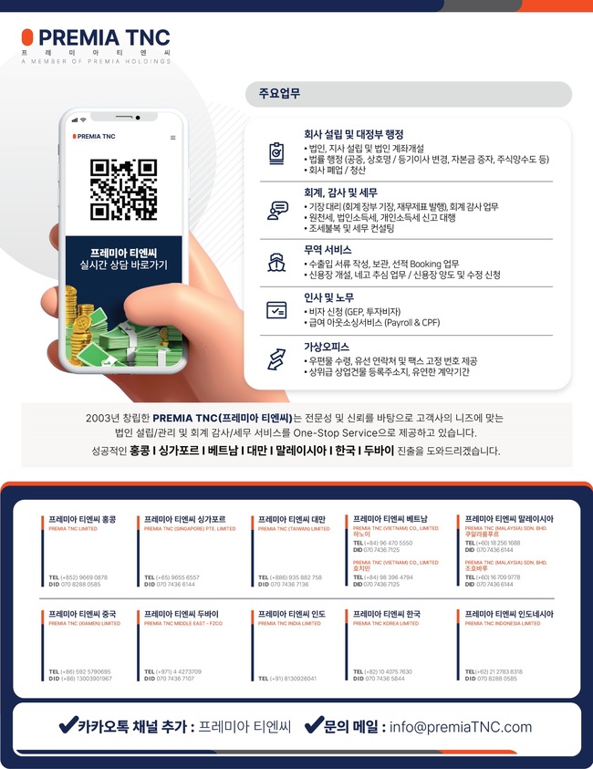 ■ 프레미아 티엔씨 (구 코차이나 티엔씨) : 법인 설립/관리, 회계 결산, 세무 자문 및 회계 감사 9669 0878, info@premiatnc.com / 웹사이트 https://premiatnc.com/kr//