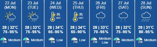 오늘과 내일 소나기가 내리겠으며 낮최고 32/33도까지 올라가겠다. 수요일과 목요일에는 34도까지 올라가 매우 더울 것으로 예상된다.