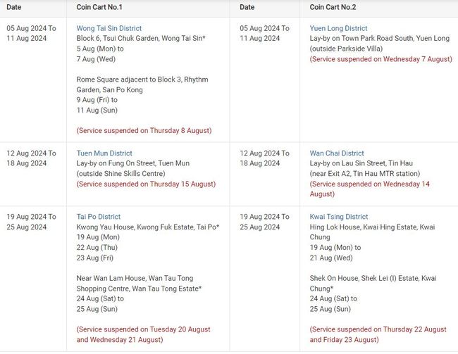 통화당국은 동전교환 차량일정 8월 19일부터 10월 27일까지의 일정을 발표했다.