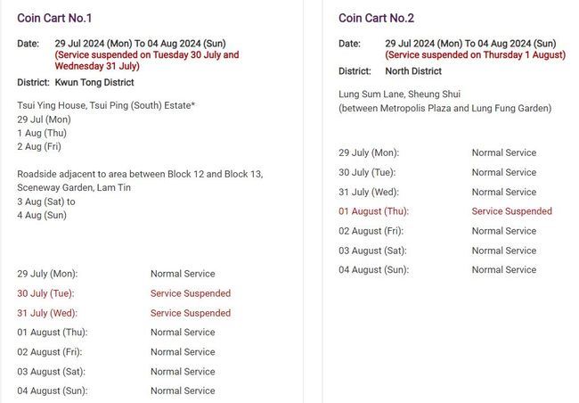 ▲ 7월 29일부터 8월 4일까지의 동전교환 차량 일정