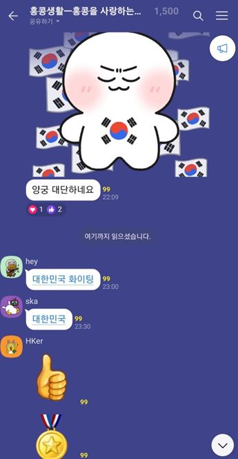 홍콩한인 교민방 "홍콩생활방1"에서는 늦은 시간에도 한국대표 선수들을 응원하기도했다.