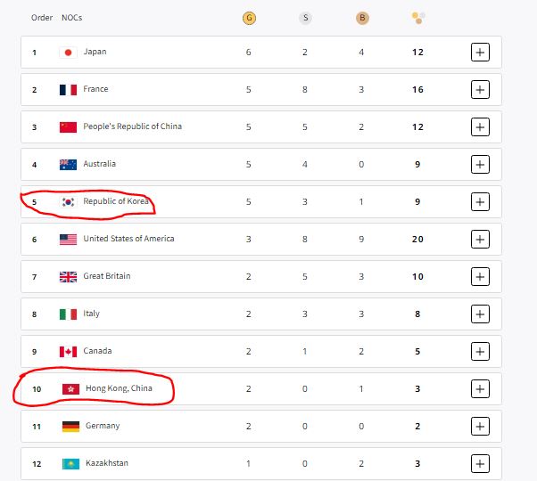 - 홍콩 10위- 금 2개(펜싱), 동메달 1개(수영)