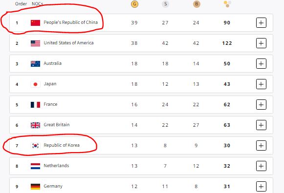 현재, 중국이 금메달 39개로 1위, 한국은 금메달 13개로 7위, 홍콩은 금메달 2개로 35위에 올랐다.