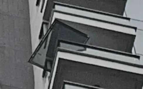아침 태풍 8호가 발효되는 동안 조던 지역 파크스 레지던스 아파트 10층에 유리창이 발코니에 아슬아슬하게 걸쳐져 있었다.
