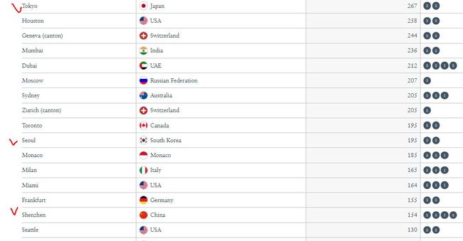 -1위 뉴욕 / 5위 베이징 347명 /싱가포르 3366홍콩 8320도쿄 11위 267서울 20위 195중국 선전 25위 134