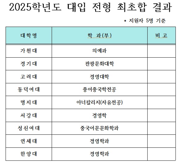 여러가지 활동과 프로그램을 통한 학교와 학생들의 노력과 묵묵히 지원을 아끼지 않은 학부모님의 힘이 합해져 가천대(의예), 경기대, 고려대, 동덕여대, 명지대, 서강대, 성신여대, 연세대, 한양대 등 학생들이 원하는 대학과 모집 단위에 다수 최초합이라는 결과를 받았다.