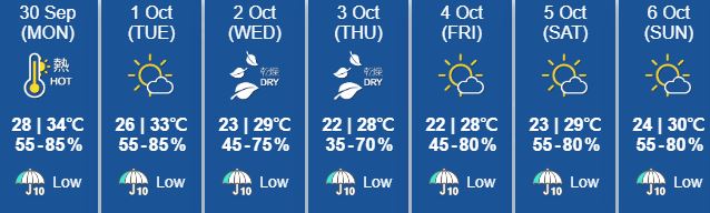 태풍은 홍콩에 직접적인 영향은 주지 않을 것으로 예상되나 수요일과 목요일에는 바람이 강해지고 약간 시원해진다