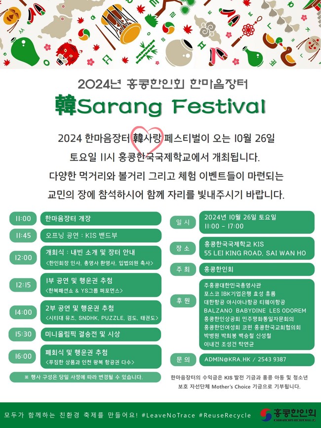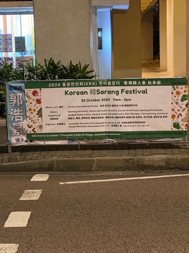홍콩섬 사이완호와 타이쿠싱 거리에 한인회(회장 탁연균)가 주최하는 한마당 축제’ 현수막이 걸렸다.  Korean Festival이 우리 홍콩 한인 커뮤니티만의 행사가 아니라 홍콩 현지인들과 함께 하는 축제가 되었다