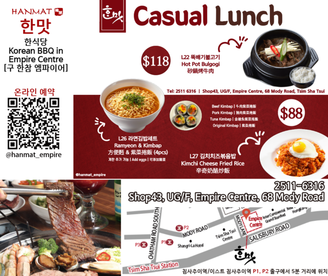 ▲ 한맛엠파이어(구한참엠파이어) 는문화나눔의한식당, 동침사츄이리갈구룡호텔맞은편, 예약번호2511 6316, 침사추이P1 , P2 출구