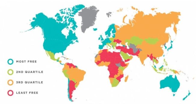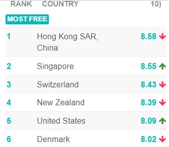 가장 경제적으로 자유로운 경제권 홍콩(1위), 싱가포르(2위), 스위스(3위), 뉴질랜드(4위), 미국(5위), 덴마크와 아일랜드(6위), 캐나다(8위), 호주와 룩셈부르크(9위), 일본(11위), 영국(12위), 독일(16위), 대만(19위)를 차지했으며 한국은 32위, 중국은 104위에 랭크되었다.