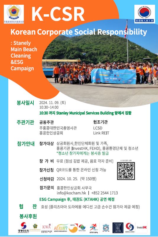 ■ 홍콩한인상공회가 주관하는 K-CSR(사회적책임활동) 개최 오는 11월 9일(토)에 한인상공회가 주최하는 K-CSR 활동(해변정화 활동이 진행됩니다. 10월 25일까지(약 150명) 신청받습니다. 청소년 참가자에게는 '봉사증' 발급해 드립니다. ■주한국문화원 10월 문화제 개최