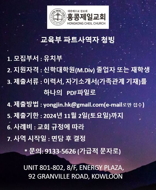 홍콩제일교회-교육부 파트사역자 청빙